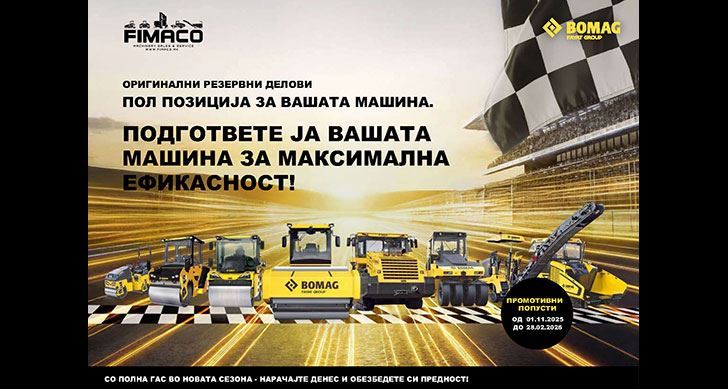 Подгответе ги Вашите машини за максимална ефикаснот и набавете оригинални резервни делови по промотивни цени • Филтер сетови за сите машини • Потрошни делови за финишери + гребалки • Пумпи за вода • Акумулатори • Гуми за валјаци • Ножеви за гребење асфалт ПРОМОТИВНИ ПОПУСТИ ОД 1.11.2025 до 28.02.2026 година
