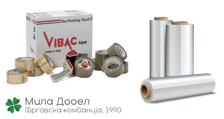 Дистрибутер на висококвалитетни селотејп траки произведени од глобалната компанија VIBAC, Италија, и директен увозник на висококвалитетна стреч и престреч фолија произведена во ЕУ.